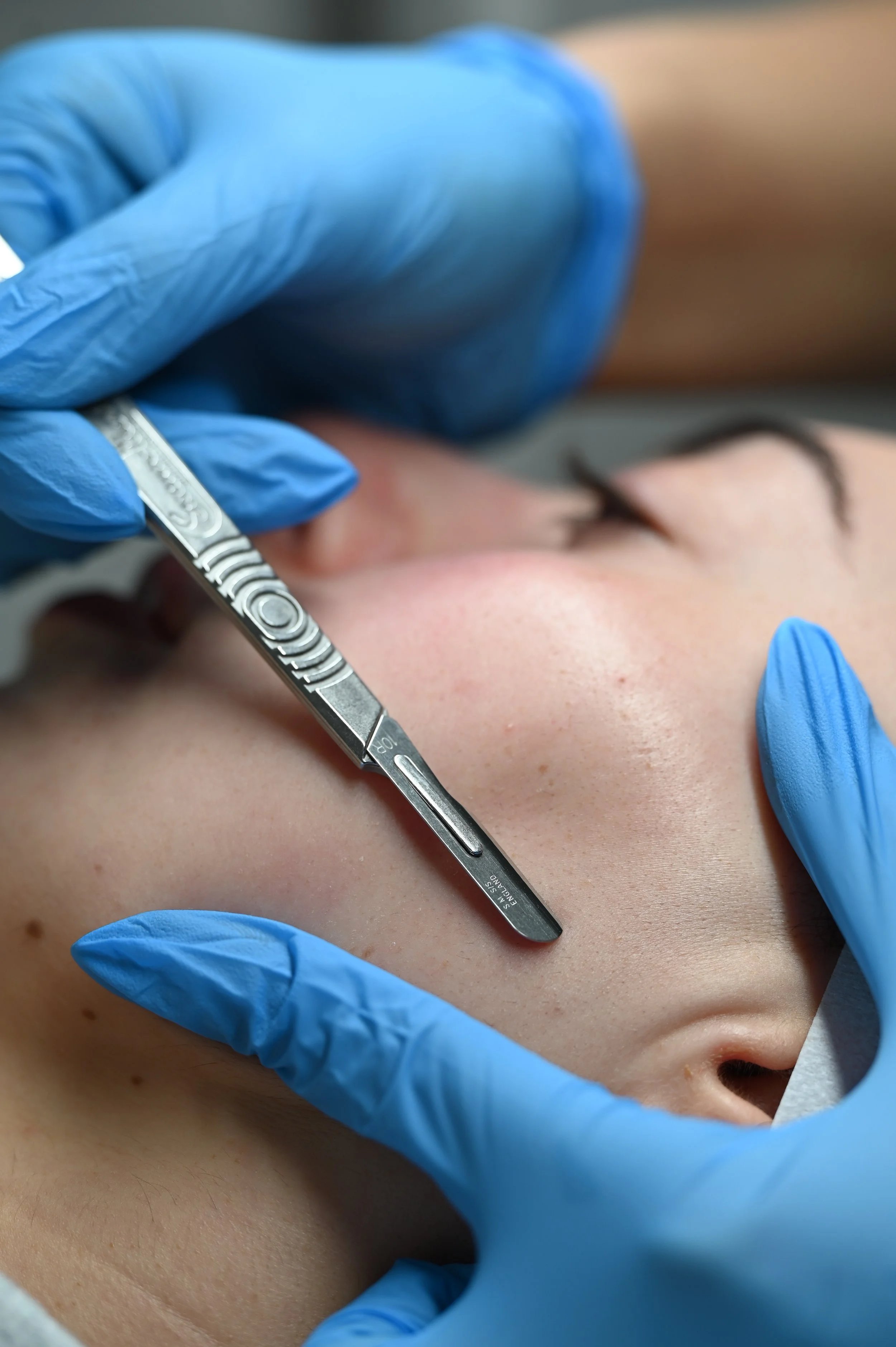 Dermaplaning is a procedure that involves using a surgical scalpel to gently exfoliate the top layer of dead skin cells and vellus hair (commonly known as "peach fuzz") from the face. This non-invasive treatment helps to reveal smoother, brighter skin, while also allowing skincare products to better penetrate the skin for enhanced effectiveness.