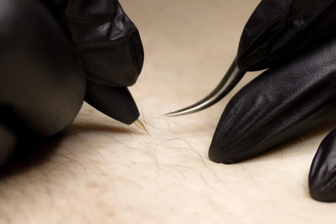 Electrolysis is a method of permanent hair removal that works by delivering a small electrical current into each individual hair follicle, effectively destroying the growth centre of the hair. It is suitable for all skin types and hair colours, including white and blonde hairs that cannot be treated with laser